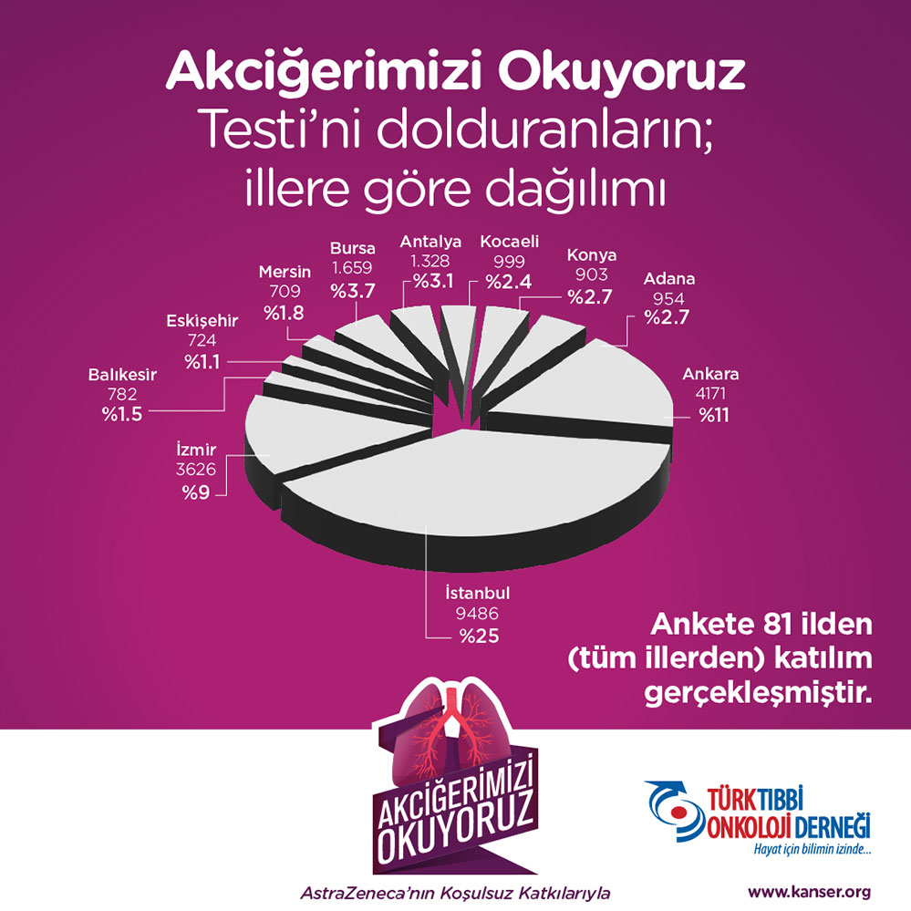 “Akciğerimizi Okuyoruz” internet platformu üzerinden Türkiye genelinde 81 ilde yaşayan 38 bin 623 kişiden anonim şekilde elde edilen verilere göre katılımcıların yüzde 63,4’ü erkeklerden, yüzde 36,6’sı ise kadınlardan oluştu. Katılımcıların yüzde 52,5’ini 30 – 49 yaş arası kişiler oluştururken bu grubu sırasıyla yüzde 31,5 ile 50 – 69 yaş arası, yüzde 13 ile 18 – 29 yaş arası ve yüzde 3 ile 70 yaş üzeri kişiler takip etti. Katılımcıların yaşadığı illere göre dağılımda ilk sırada yüzde 24,6 ile İstanbul yer aldı. Ankara yüzde 10,8 ile ikinci olurken İzmir yüzde 9,4 ile üçüncü oldu.
