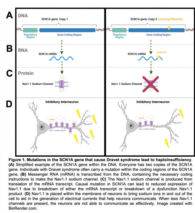 Yukarıda da belirtildiği gibi Dravet sendromu vakalarının %90’ından fazlası Nav1.1’i kodlayan SCN1A geninin iki kopyasından birinde meydana gelen mutasyonlardan kaynaklanıyor. Bu da Nav1.1 sodyum kanallarının %50 daha az olması anlamına geliyor.