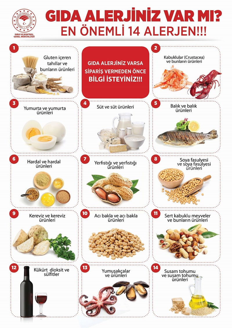 Türk Gıda Kodeksi Gıda Etiketleme ve Tüketicileri Bilgilendirme Yönetmeliği’ne göre; gluten içeren tahıllar, yumurta, hardal, kereviz, yerfıstığı, acı bakla, balık, soya fasulyesi, sert kabuklu meyveler, deniz kabukluları ve yumuşakçaları, susam tohumu, süt ve bunların ürünleri ile kükürt dioksit ve sülfitlerin bildirim zorunluluğu bulunuyor. Bu liste Avrupa Birliğinde uygulanan mevzuattan alındı.