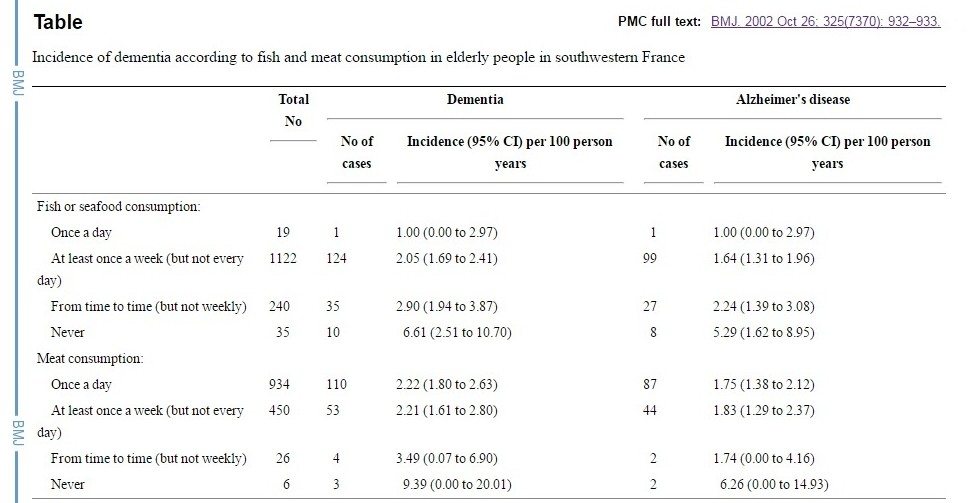Bordeaux Üniversitesinin 68 yaş ve üzeri sağlıklı 1674 kişi ile 7 yıl boyunca yaptığı ve 7. Mayıs 2002 tarihinde British Medical Journal dergisi yayınladığı büyük bir araştırmanın sonuçları haftada en az bir kez balık yiyenlerde Alzheimer riskinin üçte bir oranında düştüğü görüldü. (5) Bu olumlu etki, balıkta bulunan omega-3 yağ asitlerinin damarları koruyarak beyinde iltihaplanma riskini azaltmasıdan kaynaklanıyor.