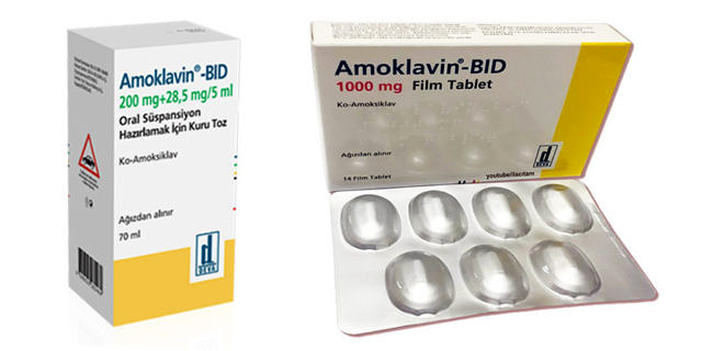 - Amoklavin-Bid: Sulandırıldığında 35 ml, 70 ml, 100 ml veya 140 ml süspansiyon elde edilen kuru toz halindedir. Her 5 ml süspansiyon 200 mg + 28 mg ya da 400 mg + 57 mg etken madde içerir (amoksisilin + klavulanik asit). Kutuda uygulama enjektörü ya da ölçü kaşığı bulunur.