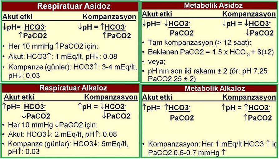 Kural 4: Respiratuar olaylarda beklenen pH hesaplanarak olaya metabolik komponentin eklenip eklenmediği tespit edilir. Akut respiratuar asidozda; pH farkı =0.008 x (PCO2– 40) kadar fark beklenir. Daha az düşüş olduysa olay metabolik alkalozla kompanse edilmeye çalışılmıştır. Daha fazla düşüş olduysa olaya metabolik asidozda eşlik etmiştir. Akut respiratuar alkalozda; pH farkı = 0.008 x (40- PCO2) kadar fark beklenir. Daha az artış olduysa olay metabolik asidozla kompanse edilmeye çalışılmıştır. Daha fazla artış varsa olaya metabolik alkalozda eşlik etmiştir. Kronik olaylarda ise 0.003’le çarpılır. İlk örneğimize bu kuralı uygulayacak olursak; pH farkı =0.008 x (PCO2– 40) = 0.008 x (79-40)= 0.312. 7.40 – 0.312 = 7.088 olmalıydı. Ancak bizim örneğimizde pH = 7.13 yani bu örnekte respiratuar asidoz metabolik alkalozla kompanse edilmeye çalışılmıştır. İkinci örneğimize baktığımızda; pH farkı = 0.008 x (40- PCO2) = 0.008 x (40-30)= 0.08. 7.40 + 0.08 = 7.48 olmalıydı. Ancak örneğimizde pH = 7.50 olduğu için olaya metabolik alkalozda eşlik etmiştir.