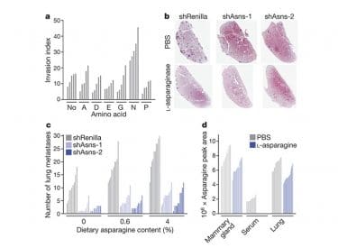 Asparagin kullanımı azalttığında orjinal tümörün durumunda, yani bizzat memede bulunan tümörlerde bir gerileme olmadığı ancak daha az metastaz oluştuğu görüldü. Öte yandan asparagin bakımından zengin gıdalarla beslenen kontrol grubundaki farelerde metastaz oranının arttığı tespit edildi. Sonuç olarak şunu söyleyebiliriz: Asparaginin varlığı hastalığın seyrini olumsuz etkileyen önemli bir amino asittir.