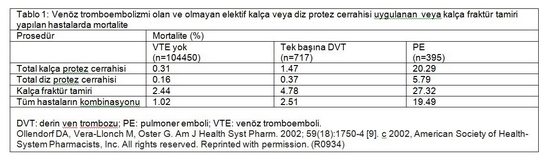 Majör ortopedik cerrahiye alınan hastalar için, VTE-ilişkili ölüm riski özellikle yüksektir. 100000’den fazla hastanın retrospektif bir değerlendirmesinde, PE gelişiminin mortaliteyi yaklaşık 20 kat artırdığını göstermiştir (bkz Tablo 1) (9). Daha sonraki semptomatik PE gelişimi olmadan tek başına DVT gelişiminin mortaliteyi iki kattan daha fazla artırdığı rapor edilmiştir. Ancak, VTE ilişkili olaylardan dolayı birçok ölüm vakası etkili tromboprofilaksi önlenebilir (5). Aslında, VTE’nin hastanelerde en sık önlenebilen ölüm sebebi olduğu düşünülmektedir (2).
