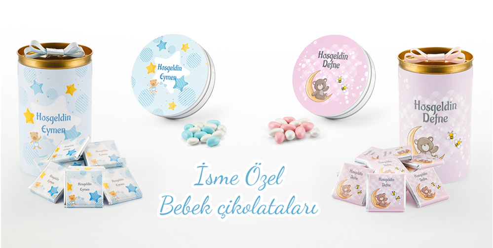 Öncelikle; Yeni doğan bebeklere özel tasarlanmış şık konseptli ve bebek detayı içeren çikolata çeşitleri ile sevdiklerinizi mutlu edebilirsiniz. Bebek çizim detaylarıyla ve isteğe özel aksesuarlar ile tasarlanan bebek çikolataları, bebek görmeye gelen ziyaretçilere de dağıtılabilen çok amaçlı hediyeliklerdir. Sevimli detaylarla hareketlendirilen ve bebeğin cinsiyetine göre süslenen kaliteli ve modern birbirinden özel “Hoş geldin Bebek” konseptli çikolatar, en çok ilgi gören çikolata çeşitleri arasında yer almaktadır.