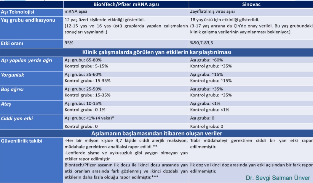 Ülkemizdeki Covid 19 aşı programında şu süreçte iki aşı bulunmaktadır. Biontech/Pfizer’in geliştirdiği mRNA aşısı ve Sinovac’ın geliştirdiği zayıflatılmış virüs aşısı. Her iki aşının da yan etkilerinin çoğunun hafif ya da orta şiddette olduğu, 2-7 gün içerisinde kaybolduğu gösterilmiştir.
