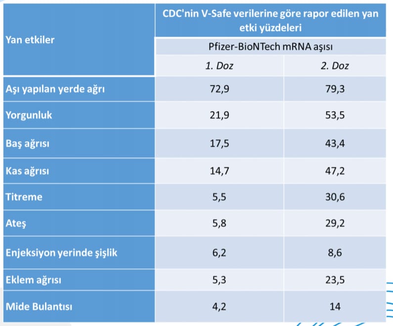 Amerika Birleşik Devletleri Hastalık Kontrol ve Önleme Merkezi (CDC)’nin aşı izleme programı V-Safe verilerine göre Biontech aşısının 1. dozu ve 2. dozundan sonra ortaya çıkan yan etkilerin oranları tabloda özetlendi. (3)