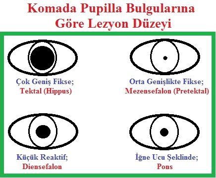 Komada pupilla bulgularına göre lezyon düzeyi: Çok geniş fikse; tektal (hippus). Orta genişlikte fikse; mezensefalon (pretektal). Küçük reaktif; diensefalon. İğne ucu şeklinde; pons.