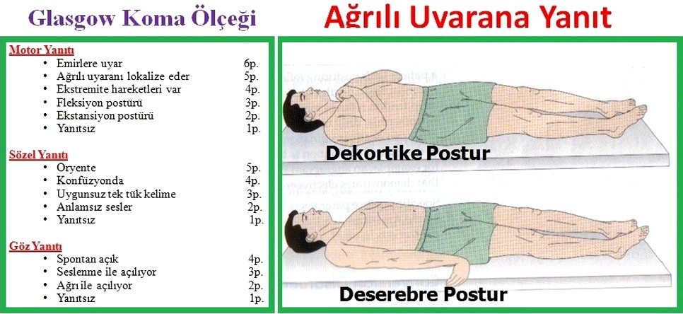 Glasgow koma değerlendirmesi: Gözler: spontan olarak açık 4, sözlü emirlerle açık 3, ağrı ile açık 2, cevap yok 1. Motor cevap: sözlü emirlere uyuyor 6, ağrılı emirlere lokalize ediliyor 5, fleksiyon – çekiyor 4, dekortike rijidite 3, deserebre rijidite 2, cevap yok 1. Verbal cevap: oryante ve konuşuyor 5 disoryante ve konuşuyor 4, uygunsuz sözcüklerle 3, amlamsız seslerle 2, cevap yok 1.——