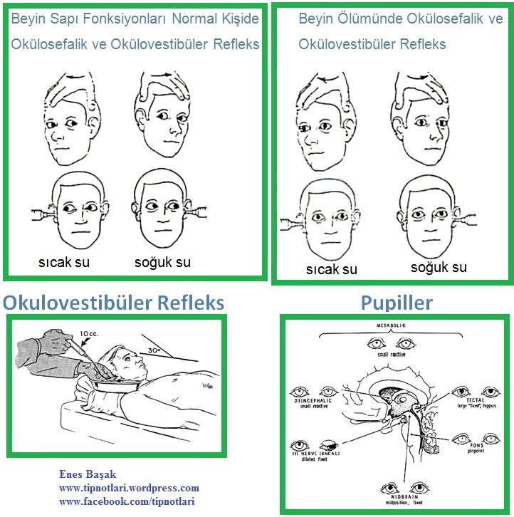 Beyin ölümü tanı ilkeleri: 1-İrreversibl, yanıtsız koma olmalı. 2-Spontan solunum durmalı. 3-Beyin sapı refleksleri kaybolmalı. 4-Deserebrasyon ve dekortikasyon postürleri olmamalı. 5-Şu belirtiler olabilir; tendon refleksleri alınabilir, nabız ve kan basıncı alınabilir, ekstremite hareketleri olabilir, terleme olabilir. İrreversibl komada ağrılı uyarana cevap yoktur. Apne testi; 10dk saf O2 solutulur, ventilatör durdurulur, kataterle O2 verilir, 10 dk süren apne 60 mmHg aşan hiperkapni oluşturur. 30 saniyede solunumu stimüle etmesi gerekir. Beyin sapı refleksler kaybolmalıdır. Pupil fix dilate, ışık ve kornea refleksleri yoktur. Kalorik teste cevap yoktur. Taş bebek göz hareketleri yoktur. Palatal ve trakeal refleksler alınmaz.