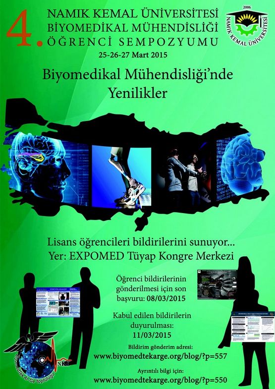 4. Biyomedikal Mühendisliği Öğrenci Sempozyumu, 25-26-27 tarihleri arasında yapılacak. Kendi alanındaki en önemli etkinliklerden birisi olan bu sempozyum Türkiye’de biyomedikal mühendislik alanında yaşanan gelişmelerin takibi acısından da önemli bir fırsat sunuyor. Namık Kemal Üniversitesi Çorlu Mühendislik Fakültesi Biyomedikal Teknolojileri AR-GE Topluluğu ve öğretim üyeleri tarafından düzenlenen “4.Biyomedikal Mühendisliği Öğrenci Sempozyumu” , 25 Mart 2015 Namık Kemal Üniversitesi Merkez Kampüs Rektörlük Konferans salonunda, 26 Mart 2015 Çorlu Mühendislik Fakültesi Konferans salonunda, 27 Mart 2015 tarihinde de Tıbbi Cihazlar ve Malzeme Fuarı EXPOMED 2015 İstanbul’da biyomedikal alanında ülkemizin seçkin akademisyenlerinin konuşmacı olarak katılacağı, çeşitli medikal sektör temsilcilerinin deneyimlerini paylaşacağı ,medikal firmaların ürün tanıtımı yapacağı bir biyomedikal sempozyumu gerçekleşecektir.