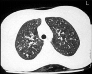 Tamamen normal görülebilir ya da, hilustan dışarı doğru uzanan radyolusent çizgiler (tram lines) veya kalın paralel çizgiler (tooth paste lines) veya kümelenmiş kistler görülebilir. Bazen bu kistlerin içinde hava-sıvı seviyeleri görülebilir. Peribronşial kalınlaşma, atelektazi veya konsolidasyon gibi nonspesifik bulgulare da olabilir.