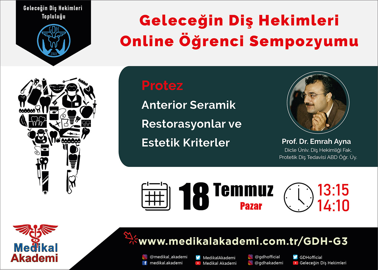 Geleceğin Diş Hekimleri Online Sempozyumu‘nun ikinci gününün bu oturumunda Dicle Üniversitesi Diş Hekimliği Fakültesi öğretim üyesi Prof. Dr. Emrah Ayna, hocamız malzeme ve preparasyon prensipleri hakkında ‘Anterior Seramik Restorasyonlar ve Estetik Kriterler’ isimli bir sunumu yapacak.