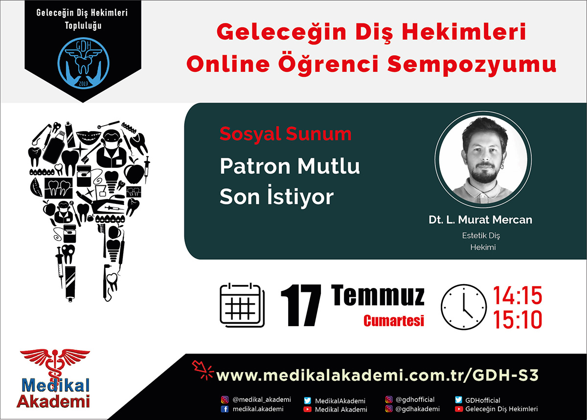Geleceğin Diş Hekimleri Online Sempozyumu’muzun bu oturumunda Diş Hekimi L. Murat Mercan, Patron Mutlu Son İstiyor isimli özel bir sunum gerçekleştirdi ve özel klinik patronlarının çalıştırdıkları diş hekimlerinden beklentilerini anlattı. Öğrencilik hayatını tamamlayıp mezun olan hekimlerin %1’inden azı kendi kliniklerini açarak çalışabiliyor. Çoğunluğu ise başka özel kliniklerde ve Diş Hastanelerinde çalışma olanağı bulmaktadır. Etkinliğimizin kaydını aşağıdaki video bölümünden izleyebilirsiniz: