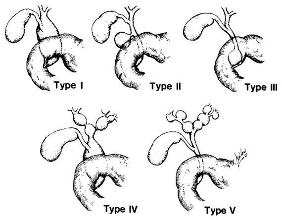 Sınıflandırma: Tip I: kistik dilatasyon (en sık – %90). Tip II: divertikül. Tip III: koledokosel. Tip IV: intra ve ekstrahepatik kistler. Tip V: intrahepatik kistler (Caroli hastalığı).
