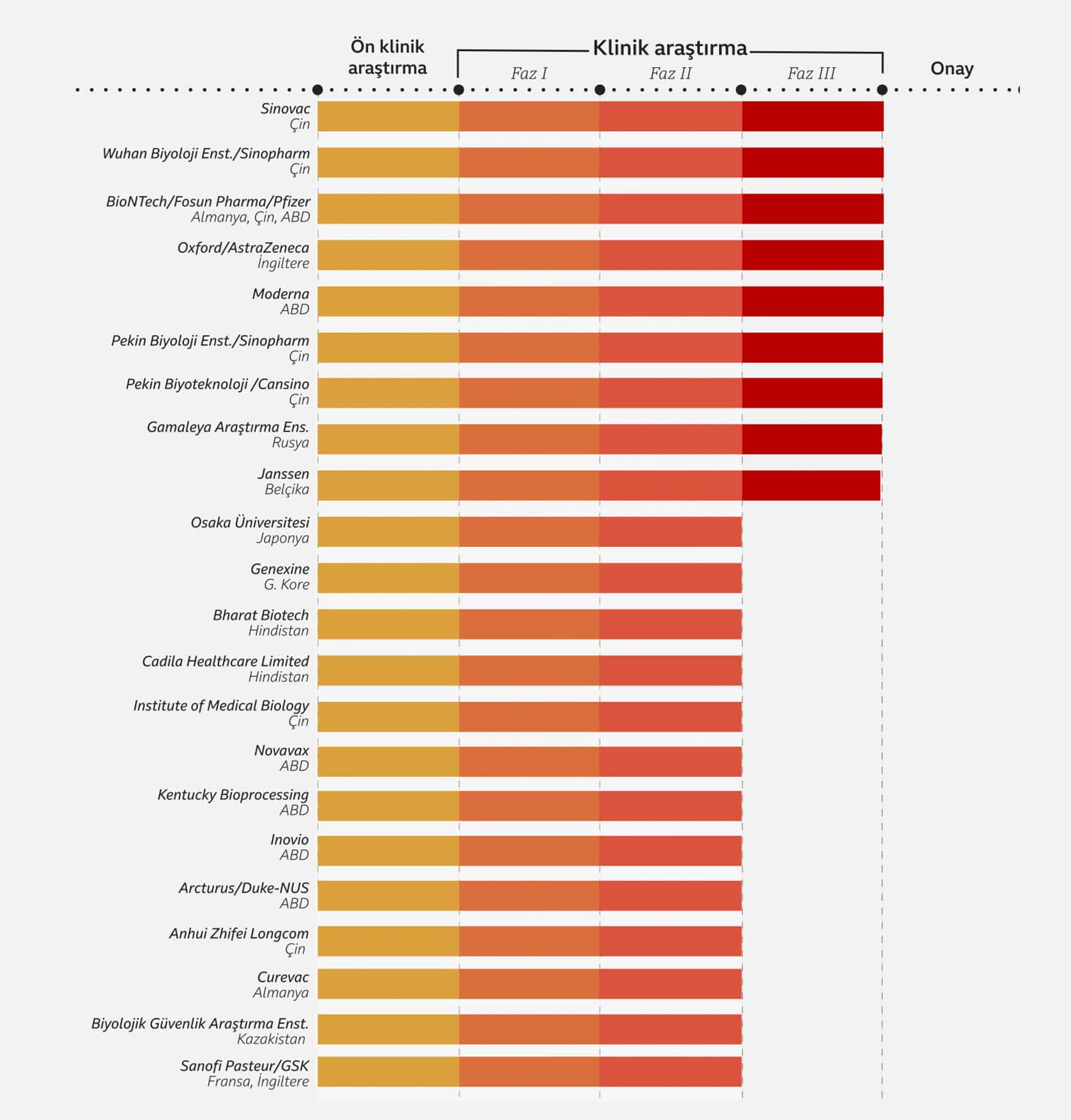 Sinovac, aşının 3. faz çalışmalarını, Türkiye’nin dışında Brezilya ve Endonezya’da sürdürüyor, çalışmaların Bangladeş ve Şili’de de başlaması bekleniyor.