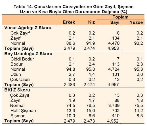 Çocukların vücut ağırlığı skor değerlerine göre, her 10 çocuktan dokuzu normal sınırlarda olup yüzde 0,2’si çok zayıf ve yüzde 2,1’i ise zayıf olarak belirlendi. Erkek ve kız çocuklarda zayıflık yüzdesi aynı olup, yüzde 2,3 olarak tespit edildi. Çocukların boy uzunluğu tespitinde yüzde 95,3’ü normal. Çocukların Beden Kitle İndeksi değerlerine göre, yaklaşık 10 çocuktan yaklaşık 7-8’i normal sınırlar içinde. Erkek çocuklar arasında hafif şişman ve şişmanlık oranı yüzde 23,3 ve kız çocuklarda yüzde 21,6.