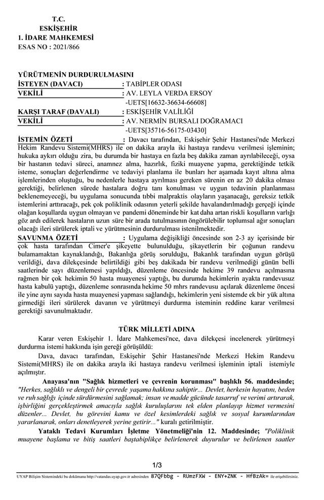 Randevu aralığının beş dakikaya düşürülmesine yargıdan durdurma kararı. Eskişehir 1’inci İdare Mahkemesi, Tabip Odası tarafından açılan davada yürütmenin durdurulmasına hükmetti. Düzenlemeye karşı harekete geçen Türk Tabipleri Birliği (TTB) ve tabip odaları, “5 dakikada hekimlik yapılmaz, sağlık 5 dakikaya sığmaz” diyerek birçok ilde basın açıklamaları düzenlemiş, ayrıca düzenlemeyi idare mahkemelerine taşımıştı. Eskişehir 1. İdare Mahkemesi, şehir hastanesinde beş dakikada bir hastaya randevu verilmesi işlemine ilişkin Eskişehir Tabip Odası tarafından açılan davada yürütmenin durdurulmasına hükmetti.