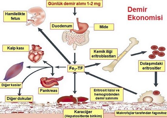 Demir ne iş yapar: DNA, RNA ve protein sentezi, oksijen taşınması, elektron transportu, hücre solunumu, pek çok enzimin yapı ve fonksiyonu.