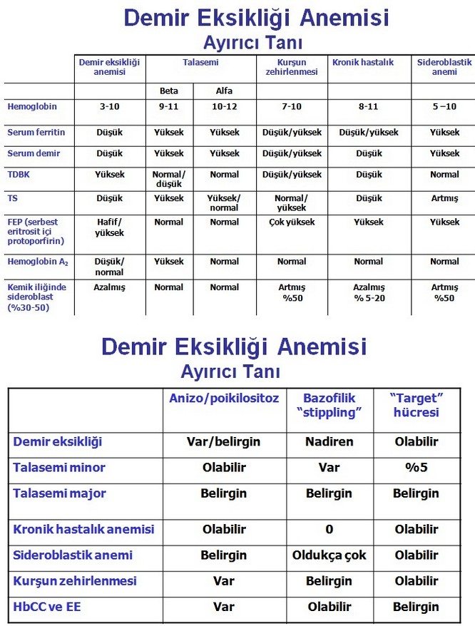 Tanı: Anemi: Hg: 15 yasın üstünde erkekte–13g/dl, 15 yaşın üstünde ve gebe olmayan kadında 12 g/dl, gebelerde ise 11 g/dl nin altında. Periferik yayma: hipokromi, anizositoz,poikilositoz vardır.—-MCV azalır. Düşük serum demiri ve yüksek demir bağlama kapasitesi. <0.15 transferrin satürasyonu, serum serbest transferrin reseptörü düzeyi.