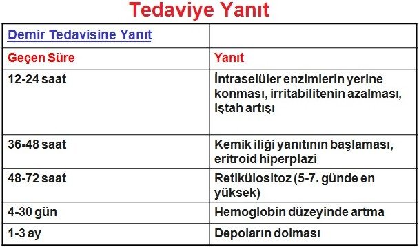 Bu nedenle tedavinin baslanmasından 2-4 hafta sonra bir kan sayımı istenmeli. Uygun demir dozları verilmis ve altta yatan neden düzeltilmis ise anemi 2-4 ay içinde düzelecek. Hemoglobin normallestikten sonra demir depolarını doldurmak için 3 ay daha demir tedavisine devam edilmeli sonraki izlemeler aneminin ağırlık derecesine, altta yatan nedene ve hastanın klinik durumuna göre (doku hipoksisi ve kalp yetersizliği bulgularının varlığı) değişir. Eğer hastanın klinik durumu gerektiriyorsa kan transfüzyonunun yapılması.