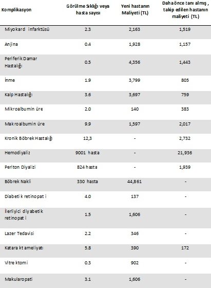 Gerçek hayat verileri kullanılarak 1 Ocak – 31 Aralık 2009 tarihleri arasında diyabet tedavisi gören 7095 hastanın verileri incelenerek hazırlanan çalışmada, diyabet hastalarının hastalıklarına eşlik eden kardiyovasküler, böbrek, göz ve nörolojik komplikasyonların doğrudan maliyeti araştırıldı. Diyabet tedavisine eşlik eden komplikasyonlar arasında yer alan kardivasküler komplikasyonların, toplam maliyetler içindeki oranının %32.7 olduğu açıklanan çalışmada, diyabetin toplam maliyeti içinde böbrek komplikasyonlarının yıllık doğrudan maliyetinin %25.1, göz komplikasyonlarının oranının %6.4 ve nörolojik komplikasyonların oranının ise % 6 olduğu duyuruldu.