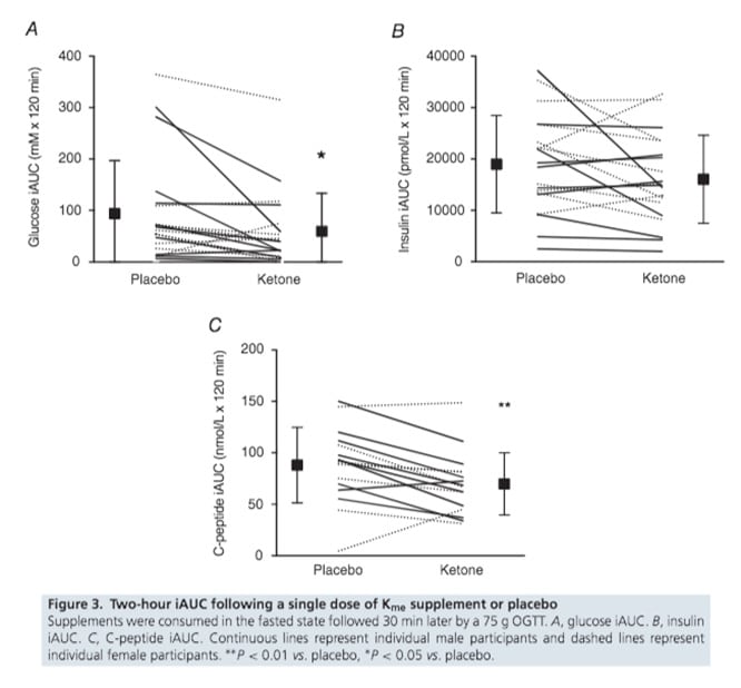 Yapılan ölçümler Keton-içecek grubundaki deneklerin kan şekeri değerlerinin plasebo grubuna göre belirgin bir şekilde daha iyi durumda olduğunu gösterdi.