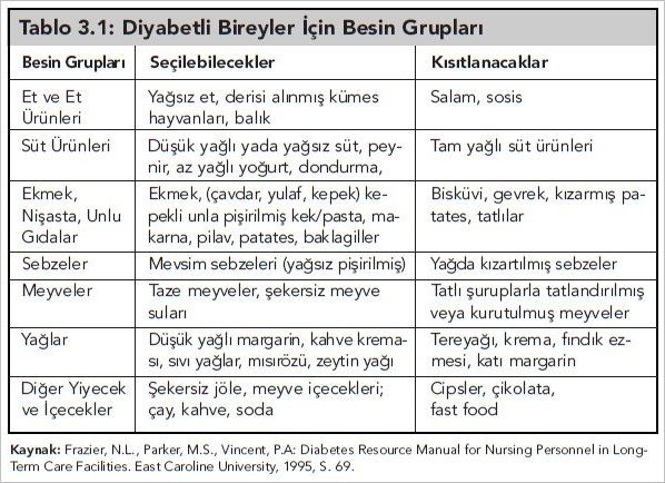 Özel diyabetik ya da diyetetik yiyeceklerin alınması gerekli değildir. Her diyabetlinin yiyecek tercihi belirlenir ve menüye mümkün olduğu kadar sevdiği yiyecekler alınır. Bireyselleştirilen öğün planı çok daha fazla doyum sağlar. Yiyecekler için “iyi” ve “kötü” kavramları kullanılmamalıdır. Çoğu yiyecekler uygun planlama varsa ve porsiyon miktarı kontrol ediliyorsa beslenme programında yer alabilir. Diyabetli bireyler için yiyecekler yoktur. Özel istekler olduğunda diyetisyenle görüşülmelidir.