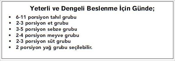 Besin gruplarını; et, süt, yağ, sebze, meyve, unlu ve nişastalı yiyecekler oluşturur.