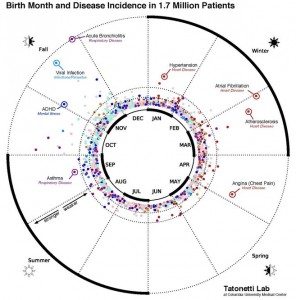 İkinci araştırma, New Yorkta 1985 ile 2013 yılları arasında 1,7 milyon hasta ve bunların müzdarip olduğu 1688 değişik hastalığın istatistiksel incelenmesi ile yapılmıştır. Araştırmadan ortaya çıkan sonuçlar doğum ayı ile 55 hastalık arasında bazı bağlantıların olduğunu gösteriyor.(2)