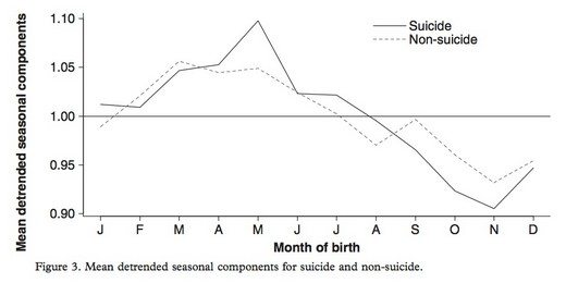 Liverpool üniversitesinin 1979 – 2001 yılları arasında İngiltere ve Galler’de yapmış olduğu başka bir araştırma, intihar ve kendini yaralama vakalarının ilkbahar doğumlularda diğer mevsimlerde doğanlara göre daha fazla olduğunu gösteriyor. 52.000 vakanın incelendiği araştırma bu oranın kadınlarda %30, erkeklerde %14 olduğunu gösteriyor (4).