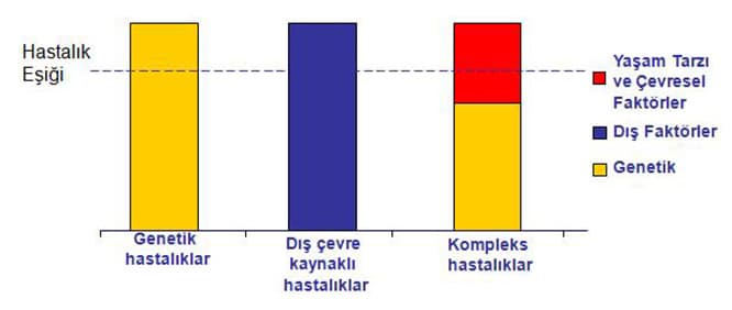 Bir de genetik yapımızda yatkınlıklarını taşıdığımız ama hastalığın ortaya çıkması için yaşam tarzı ve dış çevre ile ilgili faktörlerden olumsuz bir etkilenmenin de şart olduğu hastalıklar vardır. Günümüzde hastalık ve ölümlerin önemli bir kısmını oluşturan bu hastalıklar, ileri dönem yaygın hastalıklar veya kompleks ve kronik hastalıklar olarak da nitelendirilmektedir. 21. yüzyılda ölümlerin başlıca sebebi olan kompleks ve kronik hastalıkların başında kalp hastalıkları, kanserler, diyabet, osteoporoz, beyin-damar hastalıkları gelmektedir.
