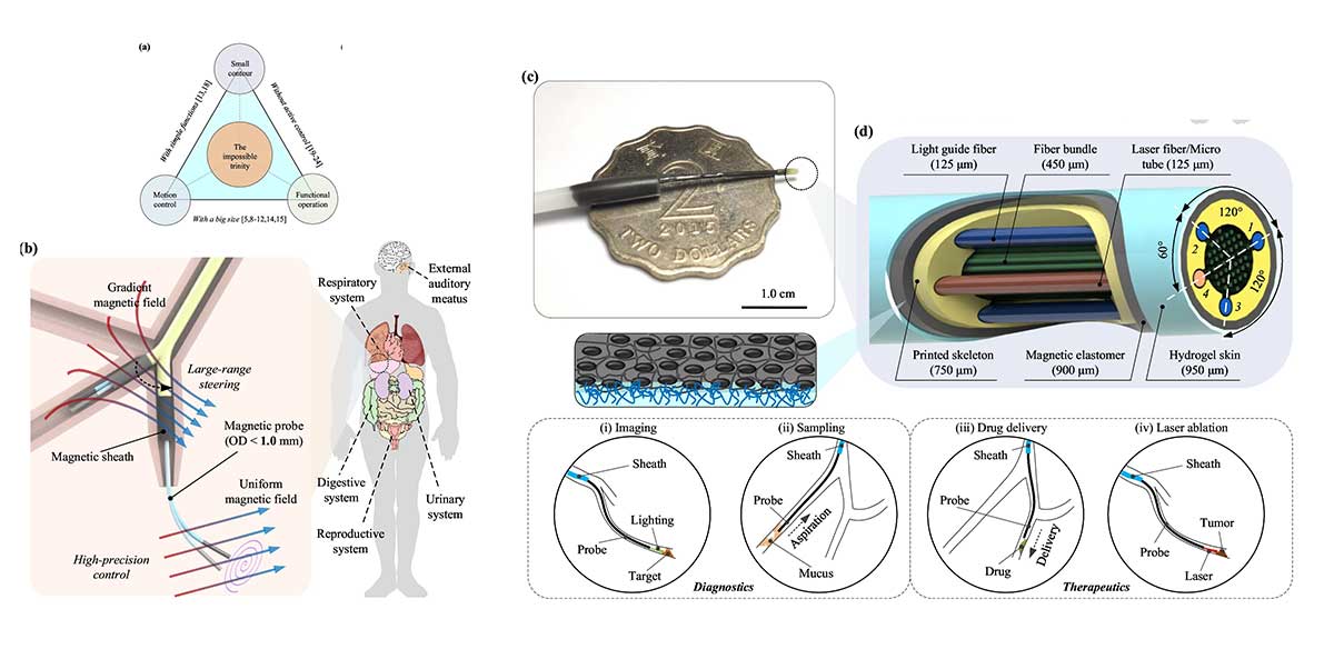 Küçük ölçekli continuum robotlar, girişimsel teşhis ve tedavi için büyük bir potansiyele sahip olsa da mevcut modeller, aynı anda küçük boyut, hassas yönlendirme ve görselleştirilmiş işlevsel tedaviyi gerçekleştirme konusunda zorluk yaşamaktadır. Bu durum “imkansız üçlü” olarak adlandırılmaktadır. Bu çalışma, görüntüleme, yüksek hassasiyetli hareket ve çok işlevli operasyon yeteneklerini alt milimetre ölçeğinde bir araya getiren optik fiber tabanlı bir continuum robot tanıtmaktadır. Mikroskobik 3D baskı ve manyetik sprey teknikleriyle elde edilen 0,95 mm’lik ince profili sayesinde bu robot, gelişmiş görüntüleme performansı sunar ve engel algılama mesafesini yaklaşık 9,4 mm’ye kadar uzatarak teorik sınırları on kat aşar. Ayrıca, robot, 30 μm’den daha az hareket hassasiyeti ve doğal görüş alanını 25 kat genişleten görüntüleme yeteneği ile dikkat çeker. Ex vivo denemeler, robotun akciğer bronş uçları gibi dar kanallarda gezinme ve örnekleme, ilaç iletimi ve lazer ablasyonu gibi çok işlevli operasyonları başarıyla gerçekleştirme yeteneğini doğrulamaktadır. Önerilen alt milimetre continuum robot, biyomedikal robotların geliştirilmesinde önemli bir ilerlemeyi temsil etmekte ve biyomedikal mühendislikte birçok potansiyel uygulamanın önünü açmaktadır.