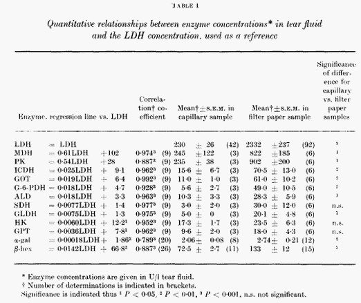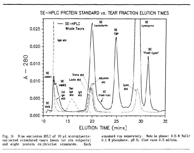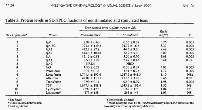 Elektroforezi tekniği ile yapılan analizlerde temel gözyaşında 80 farklı protein ve polipeptitlerin bulunduğu ve bunların % 50’sinin enzim olduğu tespit edildi. En fazla bulunan üç protein, sırasıyla Lizozim (% 24-47), Lactoferrin (% 23–29) ve Lipocalin dir (% 15–33) [20, 23].
