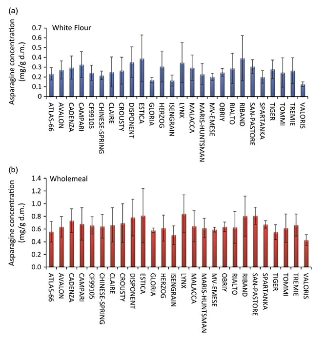 Botanikteki ismi Triticum aestivum olan ekmeklik buğdayın iki yakın akrabası iri taneli Kavuzlu buğdayı (Triticum spelta) ile Gernik‘de (Triticum dicoccum) oldukça yüksek oranda asparajin olduğu tespit edildi. Yine iri taneli başka bir buğday çeşidi olan Siyez’de de (Triticum monococcum) büyük farklılıklar kaydedildi. Siyez Unu‘nun kilogramında 550-840 miligram gibi oldukça yüksek sayılabilecek asparajin tespit edildi.