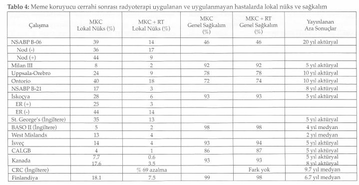 Tablo 4’de de görüldüğü gibi cerrahi sonrası radyoterapi uygulaması çalışmaların çoğunda lokal nüks oranlarının azalmasını sağlamıştır (2) Bu nedenle radyoterapi, meme koruyucu tedavinin önemli bir kom-ponentidir. Sektör rezeksiyonu yapılan ve radyoterapi alan ve almayan aksular lenf nodülü tutulumu negatif toplam 1178 hastayı kapsayan bir retrospektif çalışmada, hastalar tedaviden sonra ilk gelişen olay (ipsilateral tümör nüksü, aksular nüks, uzak metastaz ve meme dışı kanserden ölüm) açısından değerlendirilmiş ve radyoterapi almayanlarda lokal nüksün dikkat çekici olarak öne çıktığı görülmüştür (9). Günümüzde tümörün yalnızca geniş eksizyonu ile sınırlı bir tedavinin kullanılması konusu net değildir. Bu konuda titiz hasta seçimi yapılmış fakat hasta sayıları az olan çalışmaların sonuçları, hasta ve tümör karakteristiklerini gösteren yeni belirteçlere gereksinim olduğuna işaret etmektedirler . Radyoterapinin yerine sistemik tedavinin kullanılıp kullanılmayacağını araştıran NSABP B-21 çalışmasında, 8 yıllık kü-mülatif lokal nüks oranı tek başına tamoksifende % 16.5, radyoterapide % 9.3 ve tamoksifen ile radyoterapi kombinasyonunda % 2.8 olarak bulunmuştur. Bu çalışma ile tamoksifenin radyoterapinin yerini alamayacağı ancak birlikte kullanılmasının sinerji yaratacağı görülmüştür. Bu çalışmada genel sağkalım her iki kolda da benzerlik göstermektedir (10). CALGB ve Kanada çalışmalarında lokal nüks oranlarındaki dikkat çeken azalma nedeni ile cerrahi sınır negatif olmak şartıyla 70 yaş ve üzeri, lenf nodülü tutulumu negatif, östrojen reseptörü pozitif olan hastalarda cerrahi sonrası hormonal tedavinin tek başına kullanılmasının önerilebileceği bildirilmiştir (11, 12).