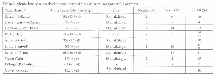 Cerrahi rezeksiyon sınırı, meme koruyucu cerrahi seçiminde en etkili belirleyicilerden biridir ve lokal kontrolü sağlamak için son derece önemlidir. Tablo 5’de de görüldüğü gibi oranlar farklı olmakla birlikte invazif karsinomları içeren çalışmaların çoğunda cerrahi sınır ile lokal nüks arasında ilişki vardır(13). Çalışmalarda görülen nüks oranlarındaki değişiklikler, primer tümörün cerrahi sınırdaki yayılmama, yaygın intraduktal komponentin olup olmamasına, pozitif sınırın tanımına, pozitif gelen cerrahi sınır sayısına ve sımr pozitifliğinin yaygınlığına bağlıdır. Pozitif sınır, spesmenin cerrahi kesit yüzeyinde tümör hücreleri bulunması şeklinde tamamlanmıştır. Pek çok çalışmada görüldüğü gibi pozitif sınıra sahip hastalarda takip süresi uzadıkça nüks gelişme oranı da artmaktadır. Pozitif sımr, meme koruyucu tedavi yapılmış invazif meme kanseri olan hastalarda hastalığa spesifik kötü prognozun bağımsız prediktörüdür. Negatif sınır tanımı ise literatürde değişiklikler göstermektedir ve kabul edilebilir sınır negatifliği kantitatif olarak halen tanımlanmamıştır. Bununla beraber negatif sınır ne kadar olursa olsun lokal nüks olasılığı tamamen yok olmamaktadır. Bu nedenle lokal nüks gelişme olasılığının cerrahi sınır durumu kadar preope-ratif ya da tümör karakterleri gibi başka faktörlerle de ilişkilendirilmesinin yanlış değildir. Tümörsüz cerrahi sınırın ne kadar olacağını destekleyen kanıta dayalı bilgi yoksa da ilk cerrahi uygulamada geniş bir negatif sınır elde edilmeye çalışılmalıdır. Cerrahi sınır genişliği ile rezidüel hastalık arasındaki ilişkiyi araştıran bir çalışmada, rezidüel hastalık oranının ancak 5 mm’lik sınır sağlanması halinde azalabileceği belirtmektedirler (28). Ancak pek çok radyasyon onkologu 1-2 göre nüks oranları mm’lik genişliği yeterli bulmaktadırlar.
