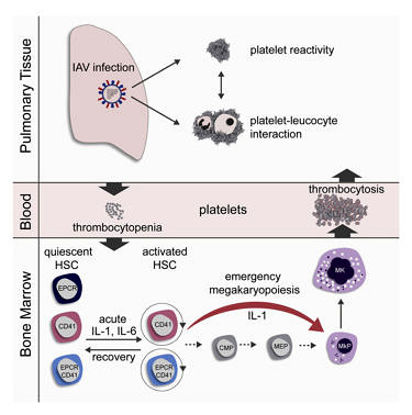İnfluenza (Grip virüsü) enfeksiyonu ile enfekte edilen farelerde bulaşı solunum yolu ile sınırlı olmasına rağmen, enfekte farelerin kemik iliğinde IL-1 ve IL-6 adında iki sitokin yüksek seviyede bulundu. Yapılan bu araştırma, bu iki sitokinin, grip enfeksiyonlarında kan kök hücrelerinin aktivasyonuna ve acil megakaryopoez önemli ölçüde katkıda bulunduğunu gösterdi. Bu keşif, İnfluenza ve diğer solunum yolu enfeksiyonlarının tadavisinde değişik stratejilerin geliştirilebileceğini gösteriyor.