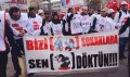 İl Sağlık Müdürlüğü önünde toplanan grup “Sağlık haktır, satılamaz”, “Angarya nöbete hayır” dövizleriyle Halk Sağlığı Müdürlüğü’ne doğru yürüdü.