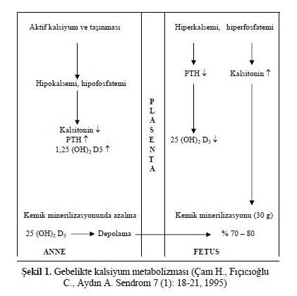 İntrauterin dönemde kemik minerilizasyonu anneden fetusa yeterli miktarda kalsiyum ve fosfor geçişi ile olmaktadır. Kalsiyum birikiminin % 70’i gebeliğin son 3 ayında gerçekleşir. Gebeliğin ilerlemesiyle annedeki kalsiyum miktarı düşerken, fetusun kalsiyum düzeyleri ise gebeliğin 28. haftasından itibaren annedeki düzeylerin üzerine çıkmaktadır. Gebelik süresince oluşan hormonal değişiklikler kalsiyum metabolizmasını etkilemektedir. Annedeki parathormon düzeyleri normaldir, ancak biyolojik aktivitesi yüksektir (Şekil 2). Maternal parathormon ve kalsitonin plasentadan geçmez. Halbuki depo D vitamini 25 (OH)D2 (kalsitriol) plasentadan geçer. Eğer maternal D vitamini deposu düşük ise fetusun kalsitriol düzeyleri de düşük olacaktır. Maternal kalsitirolün fetusa geçişi çok azdır. Buna karşılık fetusun kalsitriol sentezlenmesinde herhangi bir defekt bulunmamaktadır. Gebelik ve emziklilikte 1000 mg/gün kalsiyum alımı önerilmektedir.