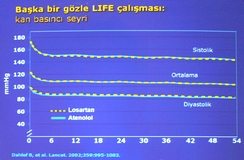 Çalışmalardan elde edilen verileri değerlendiren Prof. Dr. Güleç, “Bunca savaşın ardından kazanan hangi ilaç yada molekül? Bunu kılavuzlara soracak olursak bakın ne diyor: ‘Önemli olan kan basıncını hedef değere düşürmektir’ deniyor. Dolayısıyla ‘tüm antihipertansifler birincil ilaç olarak kullanılabilirler’ deniyor. Hepsi kaybetti yada hepsi kazandı diyebiliriz. Hatta farklı bir bakış acısıyla hastalar kaybetti diyebiliriz. En azından kazançtan kaybetti diyorum. LİFE çalışması çıktığında en çok heyecanlanan insanlardan biri de bendim. Çünkü bu çalışmada deniyordu ki Losartan ve Atenolol kan basıncını aynı değerlerde düşürmelerine rağmen kan basıncı ortalaması düşürülmüş haliyle (144/81 mm/hg) hastalar her üç ayda bir doktor grubu tarafından 54 ay boyunca kontrol edilmiş. Buna rağmen kan basıncı ortalamada bile 144 mm/hg, bu kabul edilebilir gibi görünmüyor. Life çalışması yapıldığı zaman kan basıncı 140 ve 90’nın altıydı. LİFE görünce diğerleri acaba nasıldı diye bakmak geliyor insanın içinden. Şöyle bir yorum çıkarmak olası, eğer LİFE çalışmasında kan basıncı 144 değil de 134 mm/hg olsaydı. Bu 10 mm düşüş, inmede %41 koroner kalp hastalığında %22 azalma sağlayacaktı. Dolayısıyla biz dedik ki LİFE çalışmasından sonra Losartan Antenolol’dan iyidir. Bu sonucu gölgelemek gibi bir niyetim yok. Ama yeni bir yorum olarak kan basıncı hedef değere ulaştırılamadığı için yüzlerce hasta gereksiz yere ölmüş veya kalp krizi veya inme geçirmiştir. Bu da bir yorumdur” diye konuştu.