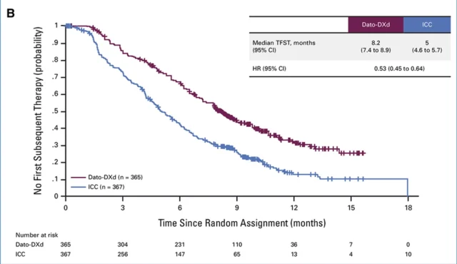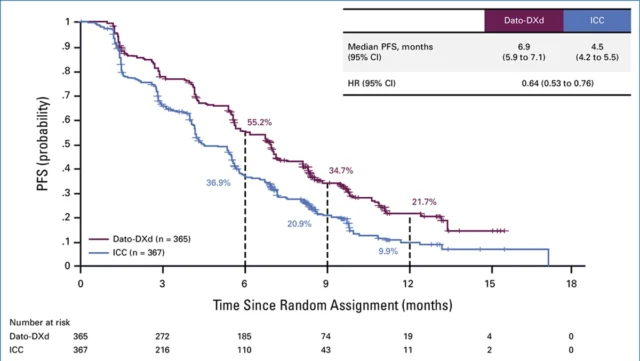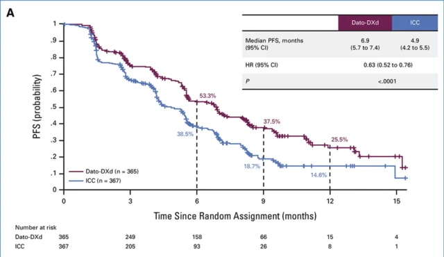 Progresyonsuz sağkalım (PFS), Dato-DXd alan hastalarda ICC’ye kıyasla anlamlı şekilde uzamıştır (6,9 ay vs. 4,9 ay). Dato-DXd, hastalık progresyonu veya ölüm riskinde %37 azalma sağlamıştır (HR: 0,63; %95 CI: 0,52-0,76; p < .0001). CDK4/6 inhibitörü kullanımı, coğrafi bölge ve önceki kemoterapi tedavisi gibi değişkenlerden bağımsız olarak tüm alt gruplarda benzer faydalar gözlenmiştir. Genel sağkalım (OS) verileri henüz olgunlaşmamış olsa da, Dato-DXd lehine olumlu bir eğilim görülmüştür (HR: 0,84; %95 CI: 0,62-1,14).