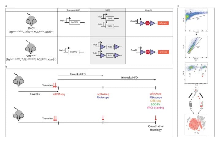 Düz kas hücrelerinin nasıl dönüştüğü ve nereye göç ettiğini bulabilmek için lineage tracing (iz takibi) adı verilen bir teknik kullanılarak hücrelerin hareketi takip edildi. Bunun için ateroskleroz olan farelerin damarlarında bulunan düz kas hücreleri mikroskop altında kırmızı görünecek şekilde özel bir kimyasal madde ile etiketlendi.