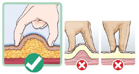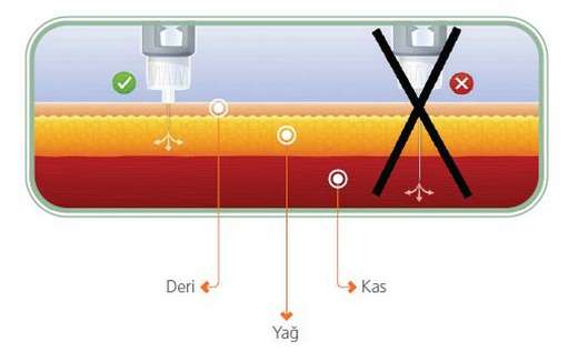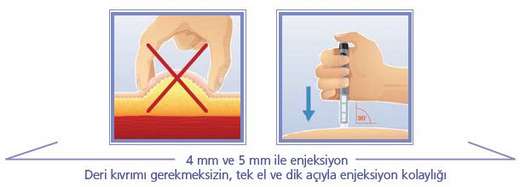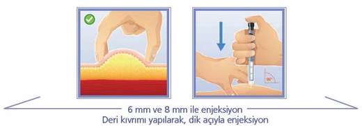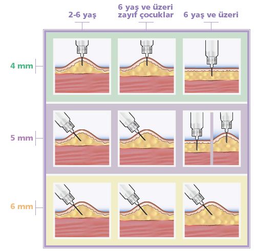 Kısa kalem iğneleri (4 mm ve 5 mm) çok küçük çocuklar ve zayıf yetişkinler dışında deri kıvrımı yapmadan kullanılır. Enjeksiyonda sıralama şöyle olmalıdır.