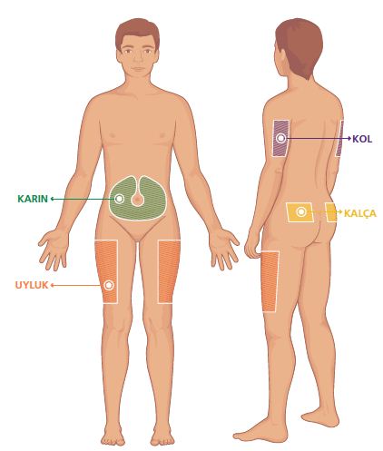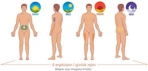 Aynı zamanda enjeksiyon bölgelerinin sağ ve sol taraflarının dönüşümlü kullanılması gerekir (örneğin; önce sağ sonra sol kol, önce karnın sağ tarafı sonra sol tarafı gibi).