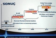 BEAUTIFUL çalışmasının miyokard enfaktüsü ile ilgili en büyük çalışma olduğunu belirten Prof. Dr. Ergene, sözlerini şöyle sürdürdü: “Çalışmaya 12 bin civarında SVD’u olan stabil KAH hastası alınmıştır. Çalışmanın protokolü gereği aktif tedavi alan ve plasebo kullanan koldaki hastalar önceden tanımlanmış olan tüm sonlanımlar için azaliz edilmiştir. Bu noktada çalışmanın sadece plasebo kolunun analizinin bile çok fazla kanıt sağladığını belirtmeliyim. İşte plasebo konlundaki bu yaklaşık 6.000 hastanın kalp hızı 70 vuru/dakika ve üzerinde olanlarında, kalp hızı 70 vuru/dakikanın altında olanlara oranla ölümcül olan veya olmayan MI nedeniyle hospitalizasyonda %46 oranında belirgin bir artış olduğu görülmüştür. Bu analizin ötesinde aktif tedavi alan kolda yapılan incelemeler kılavuz tedavileri ile sağlanan faydaların ötesinde yine kalp hızı 70 vuru/dakika ve üzerinde olan SVD’si olan stabil KAH hastalarında İvabradin tedavisi ile fatal ve non-fatal MI nedeniyle hospitalizasyonda %36’lık ilave bir risk azalması sağlandığını kanıtlamıştır. Aktif tedavi kolu ile plasebo koluna ait bu sonuç grafiklerini üst üste çakıştırdığımız zaman İvabradin tedavisi sayesinde hastaların fatal ve non-fatal MI nedeniyle hospitalizasyon riskini, kalp hızı dakikada 70 vurunun altında olan hastalar kadar azaltabiliyorsunuz.”