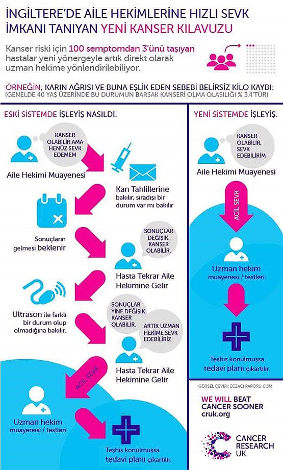 İngiltere Sağlık Hizmetleri Kurumu’nun işleyişine yardımcı olmak ve strateji belirlemek için kurulan İngiltere Ulusal Sağlık ve Klinik Mükemmellik Enstitüsü (NICE), aile hekimlerinin acil sevk yönergelerini yeni kanserle mücadele stratejisi kapsamında güncelledi. Erken teşhisin hem hayat kurtardığı hem de tedavi maliyetlerini önemli ölçüde azalttığı gerçeklerinden hareketle hazırlanan yeni kılavuza göre; aile hekimleri kanser şüphesi taşıyan 100 semptomdan 3’ü olsa bile uzman hekime direkt olarak hastalarını sevk edebilecekler. Bu yeni önerilerin hayata geçmesi durumunda, mevcut durumda erken teşhis konulabilmiş kanser hastası oranının 2020 yılına kadar %50’den %60’a çıkması bekleniyor. Aile hekimlerinin bu süreçte üzerine düşen rolün çok önemli olduğu belirtiliyor.