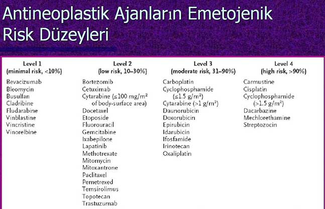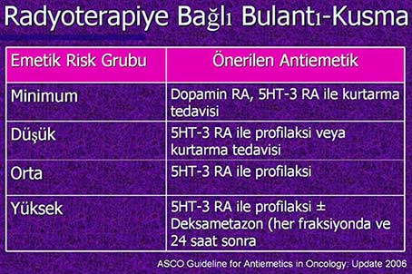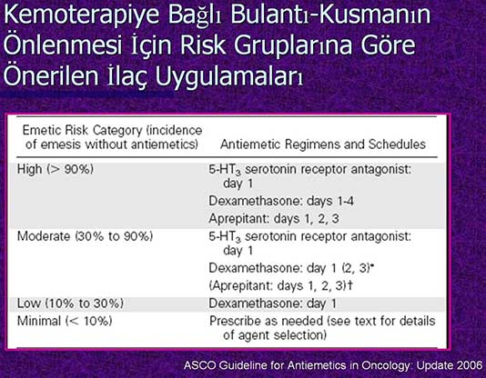 Bu nedenle hasta ile ilgili veriler göz önüne alınmalıdır. Eğer risk yüksek görülüyorsa Dexametazon 8 mg olarak önerilebilir. Yüksek risk grubunda % 90 fazla BK görme riski olan hasta grubunda Antrasiklin ve Siklofosfamid alınırsa seratonin reseptör antagonistleri, Dexametazon ve Aprepitant ilk gün uygulanmalıdır. Orta risk grubunda ise seratonin reseptör antagonistleri ve Dexametazon birlikte ilk günde verilmelidir. Düşük risk grubunda Dexametazon uygun bir seçenek olabilir” diye konuştu.