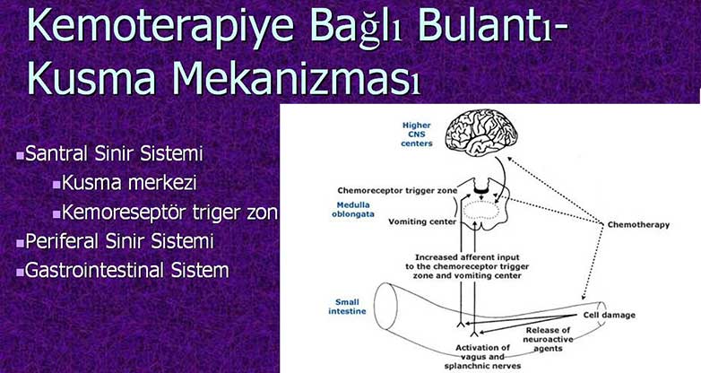 Ayrıca bulantı kusma tedavi edildikten sonra da hasta izlemine devam etmek gerekir. Ayaktan ve yatarak izlenen hastaların ilk başvurularında bulantı kusma açısından değerlendirilmesi çok önemlidir. bulantı kusmanın gelişim mekanizmasına baktığımızda kemoterapinin sinir sistemi ve gastroentestinal sistem üzerindeki etkilerini görürüz. Kusma kemoterapinin neden olduğu uyarılar sonucunda gelişiyor” diye konuştu.