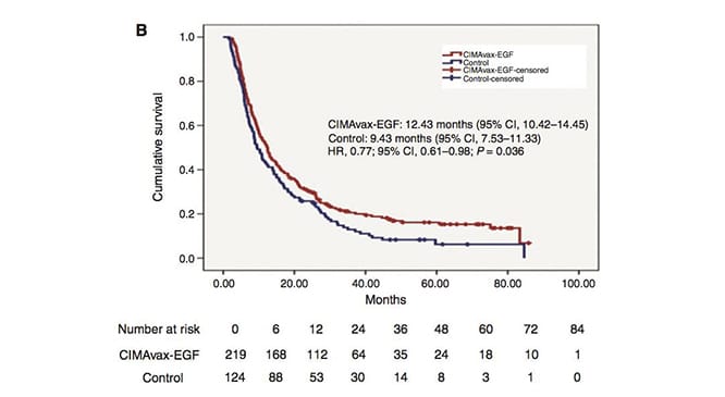 Cimavax çalışmasında da benzer şekilde aşı yapılan hastaların ortanca yaşam süresi 3 ay kadar uzamaktadır (aşı ile 12.4 aya karşılık aşısız 9.4 ay). Bu çalışmada 5 yıllık yaşam oranlarına bakılmış ve 5 yılda aşılanan hastaların %16.6’sının, aşı yapılmayan hastaların %6.2’sinin 5 yıl yaşadığı gösterilmiştir. Uzun dönem yaşam süresindeki bu fark nedeniyle (%10.4) bu aşılara Küba ve Güney Amerika ülkelerinde kullanım izni verilmiştir (Şekil B).